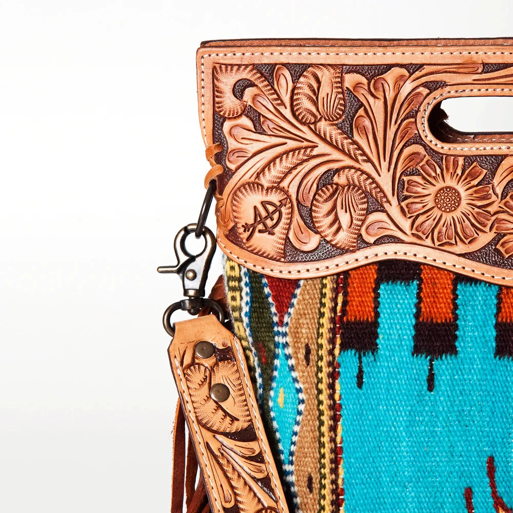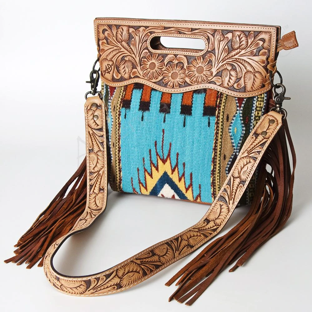 Just look at the beautiful colors in this blanket and tooled leather bag. Perfect to add just that look to any outfit you pair it up with.Â