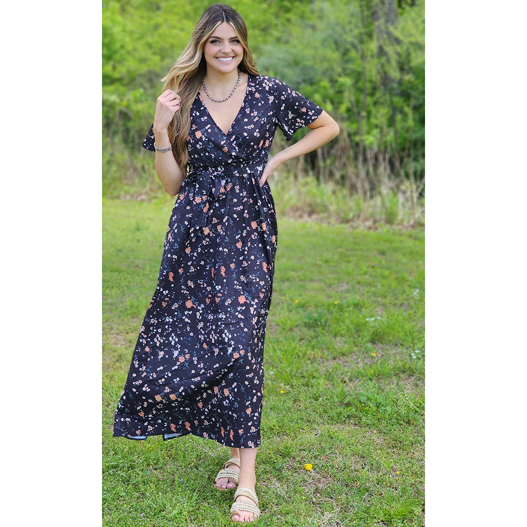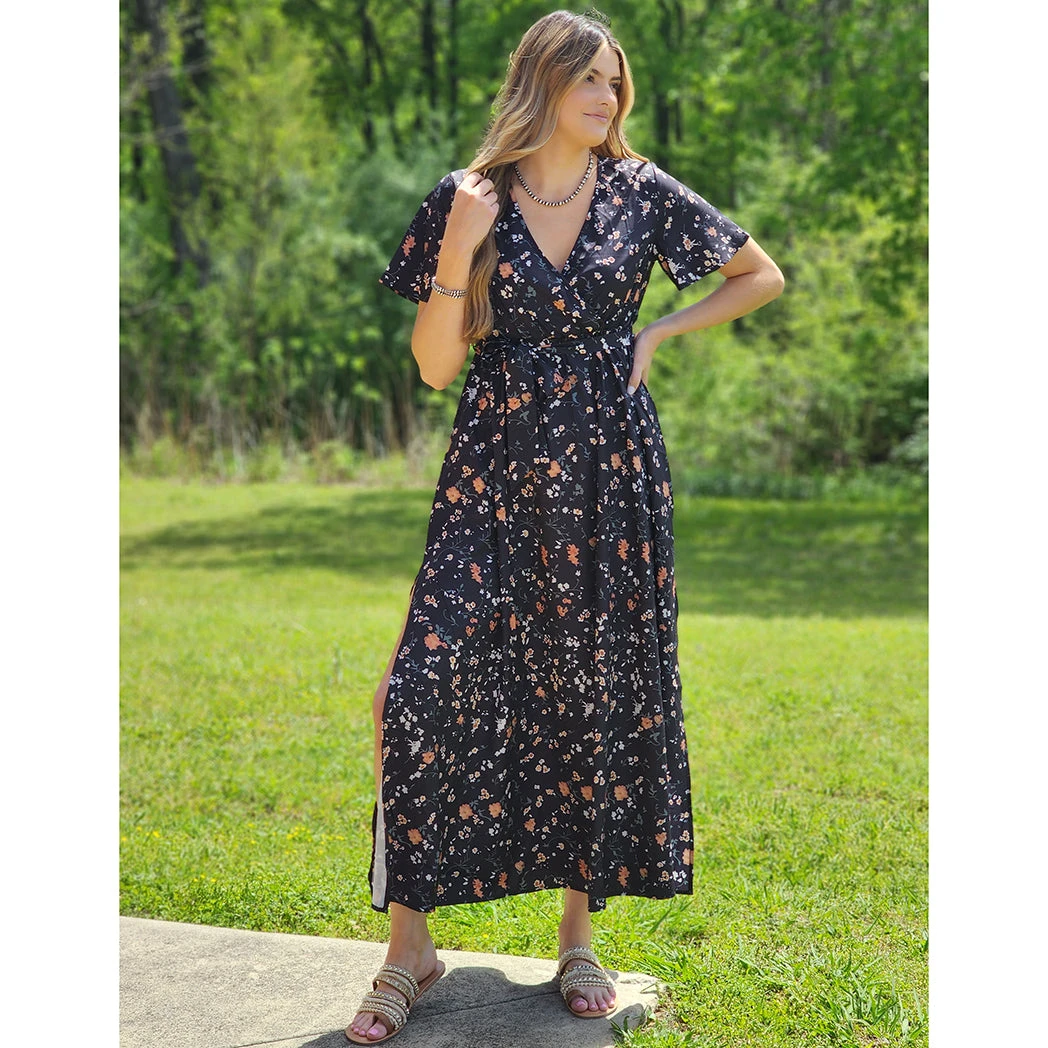 This is such an eye catching black floral dress. Pair this with your favorite boots or sandals and this will be perfect for those summer weddings and more. This dress has slits on both sides and a belt that you can tie as well.Â
