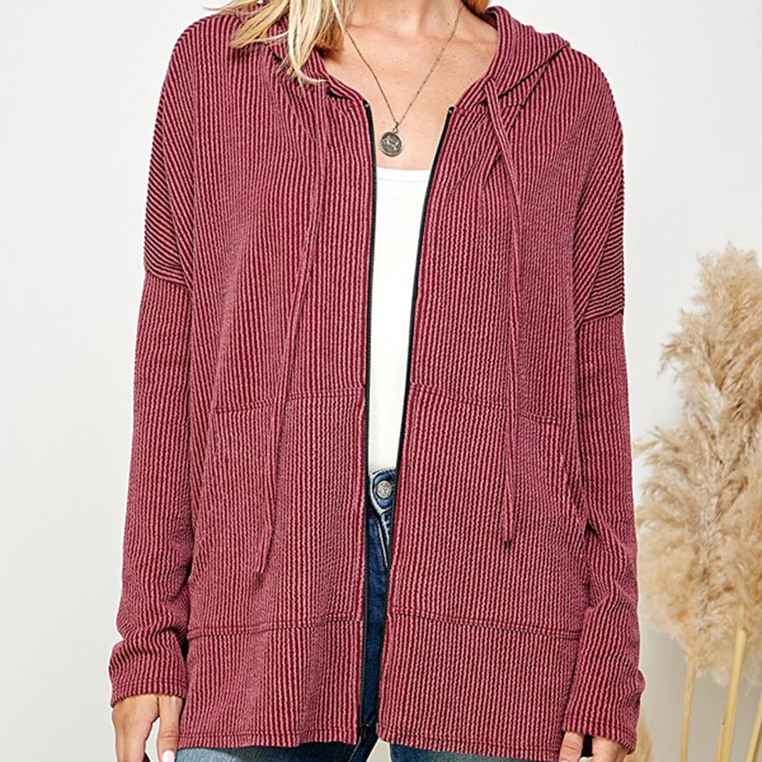 Stay warm and comfy in this fun new burgundy zip up jacket!Â