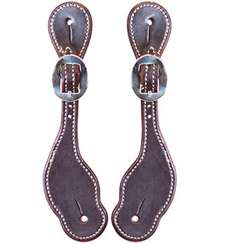 These ladies spur straps are made of a deep latigo leather. They are heavy duty with durable stitched leather and stainless steel buckles.