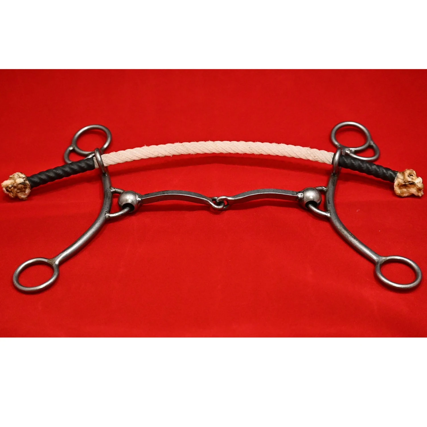 Handmade by Troy Flaharty, this combination bit offers a great weight and feel. This combination bit features the same design and shank as the Big Betty with the addition of the rope nose band. The particular bit features a square mouthpiece with a rope nose band.