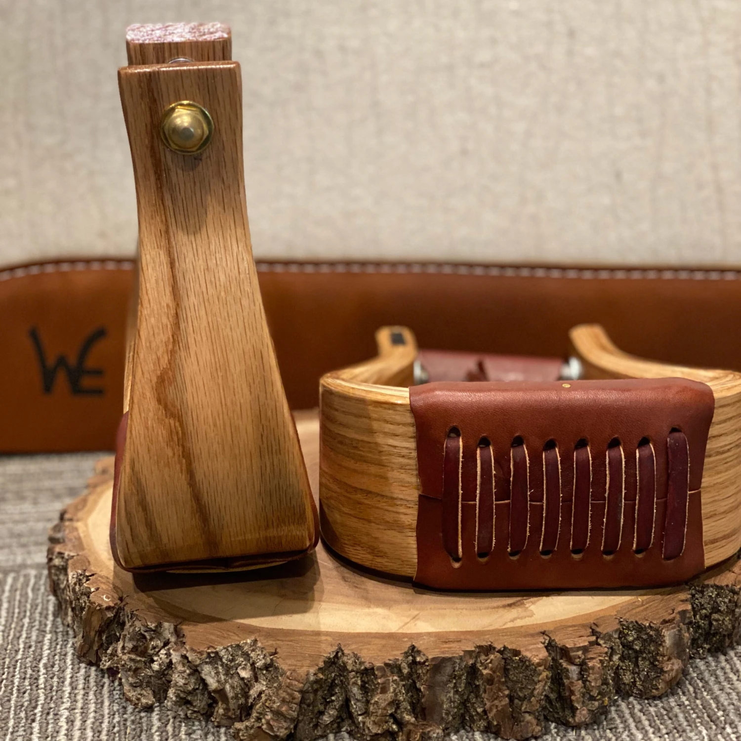 Wether you call it a Flatbottom or a Bell stirrup, This 3″ Oversized Flat bottom stirrup is an all around stirrup. It is built slightly wider across its base so your boot sits comfortably on the tread, unhindered by the stirrup sides. A slight rise, like an arch in a shoe helps set your foot for a good ride. It is a comfortable fit, no matter if you perform, ranch or trail ride. It is made with 6 pieces of laminated oak to give it extra strength while the use lf the highest quality leather for pin covers and treads.