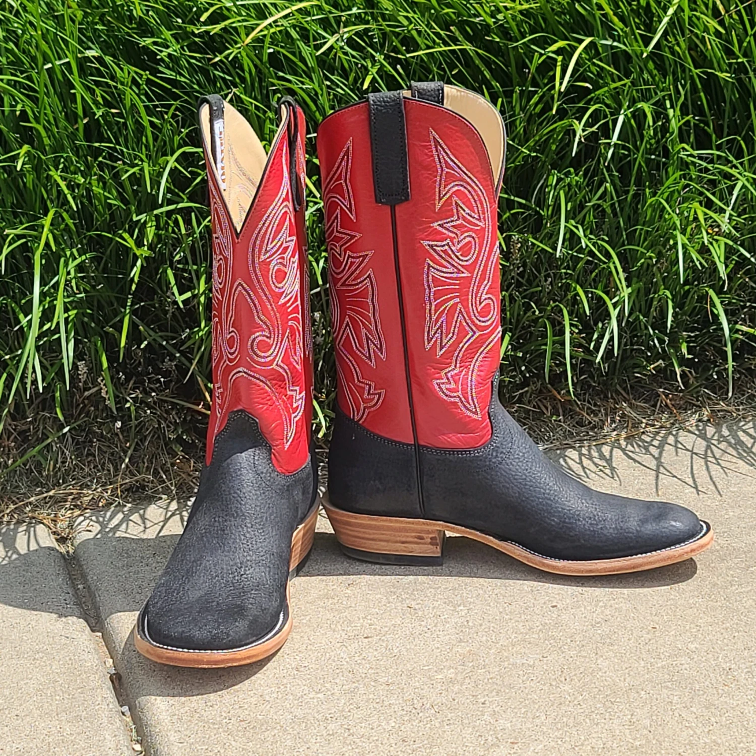 Where are our punchy boys that love round toe Olathe boots? These great black and red pig hide boots are tuff, have that riding heel & a leather sole. These are a sharp pair of boots.Â