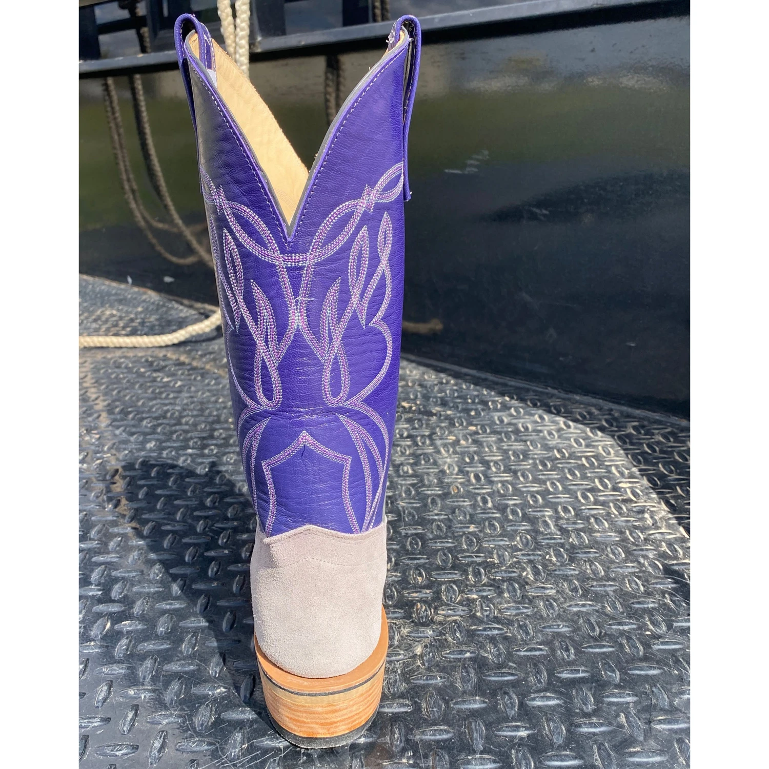 How about these Olathe Grey and Purple Boots?!? It would be hard to find sharper looking pair of boots than these! Not only do they look outstanding,  they are built to last! Made of roughout boar hide and an oxbow sole, these boots will stand up to anything you through their way!Â