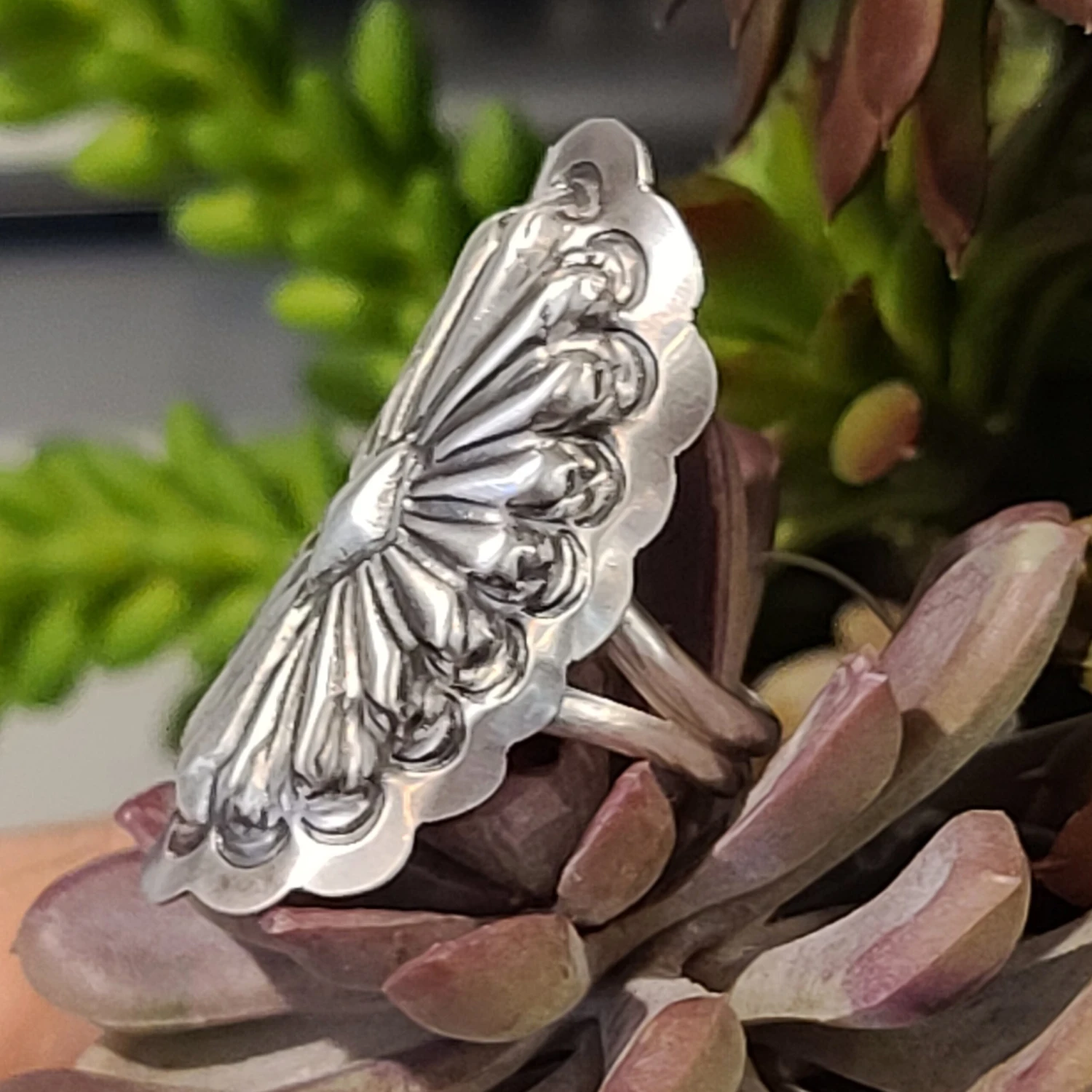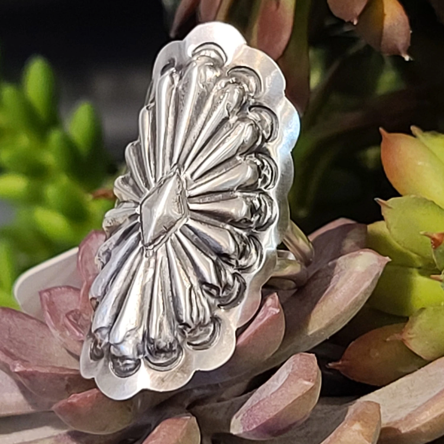 Such a great sterling silver ring. The details in the silver are great. This ring is just over an inch in length. Perfect to dress up any outfit.Â