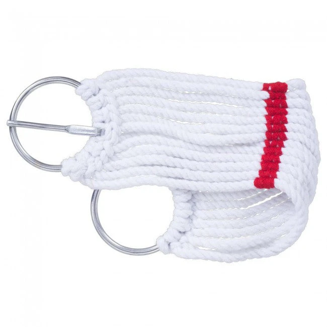 This is a traditional 13 strand acrylic cord with heavy plated tongue ring. The white color is accented with red. Â
