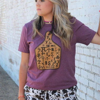 Ladies there is nothing to not like about this shirt. It features a heather burgundy colored shirt with a large ear tag centered on the shirt with a bunch of brands on the ear tag!Â